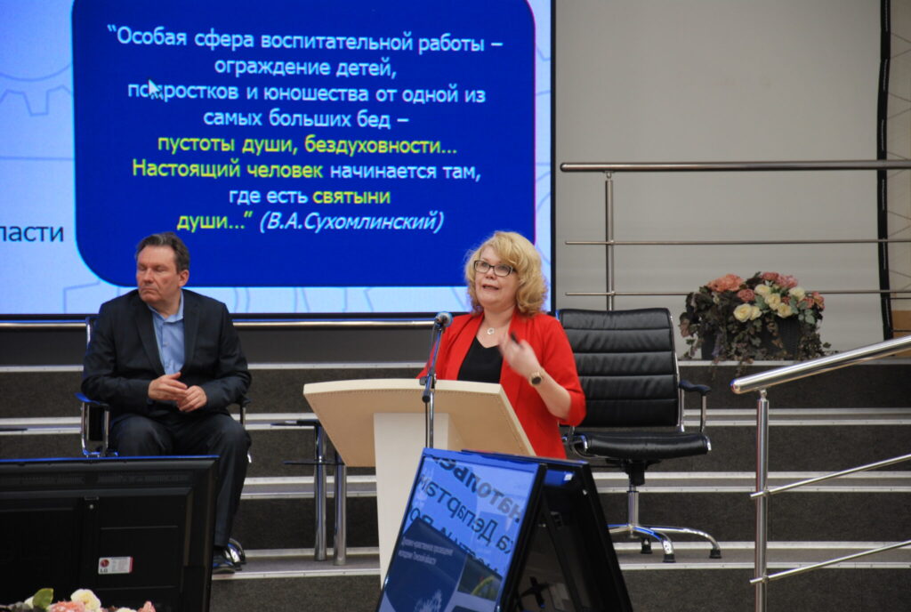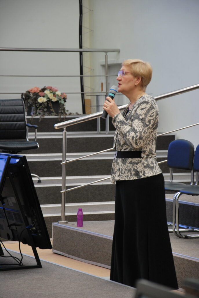 Следующей выступающей была гость конференции, Баталова Евгения Анатольевна, заместитель начальника Департамента образования Томской области по социальной деятельности и воспитанию. Темой её выступления была «Духовно-нравственные ценности молодежи»: «Россия – это Великая страна с Великой духовностью. Мы понимаем, что как учитель я могу сказать, что ученик не сосуд, который мы наполняем знаниями, это тот факел, который мы должны зажечь. Мы с вами должны обладать ценностями, которые мы должны передать».